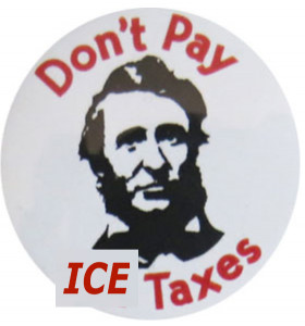 Image from National War Tax Resistance Coordinating Committee ("All Our Resources are Free"): Button showing famous tax resister Henry David Thoreau; modified to read "Don't Pay ICE Taxes."